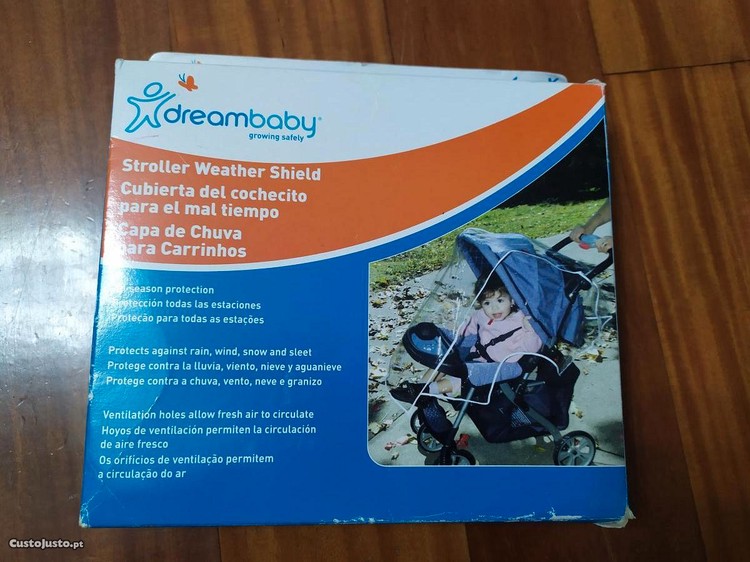 Capa de chuva para carrinhos de bebé dreambaby, tem uma forma conveniente para poder ser colocada por cima da maioria dos carrinhos.