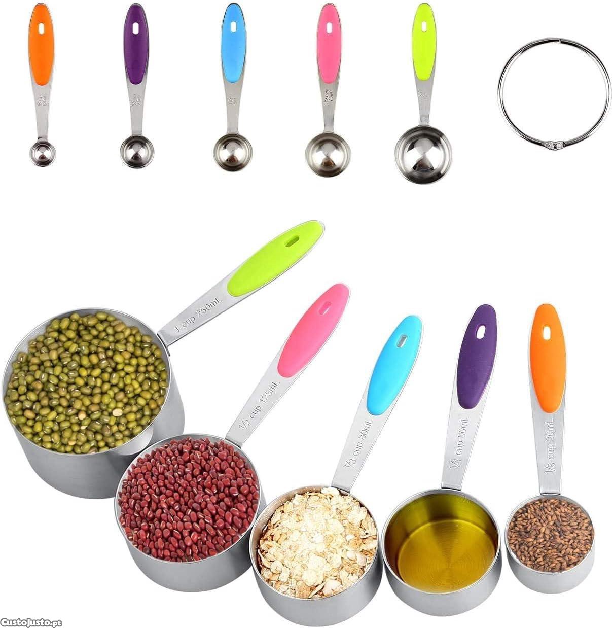 10 peças canecas medidoras colheres de medição aço inoxidável 18/8, 5 chávenas de medição 5 colheres de medição conjuntos de colheres medidas silicone antiderrapante utensílios de cozinha