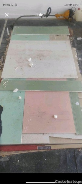 Vários bocados e placas de Pladur, na foto dá para ver, tem 3 camadas de placas de vários tamanhos.
