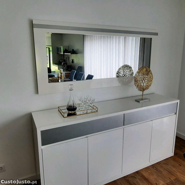 Aparador lacado a branco brilhante com 2 gavetas em cinza com fundo de veludo, 1 das gavetas tem divisória para talheres.