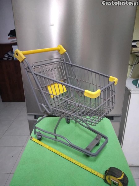 Carrinho de compras de metal. Pequeno. Imitação fiel. Serve para decoração de loja, casa, quarto de crianças. Medidas 30 cmts de comprimento, 35 de altura maxima e 21 de largura.