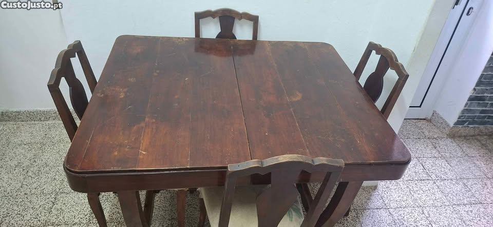 Mesa de madeira de jantar com 110 cm por 90 cm com 4 cadeiras com marcas de uso.