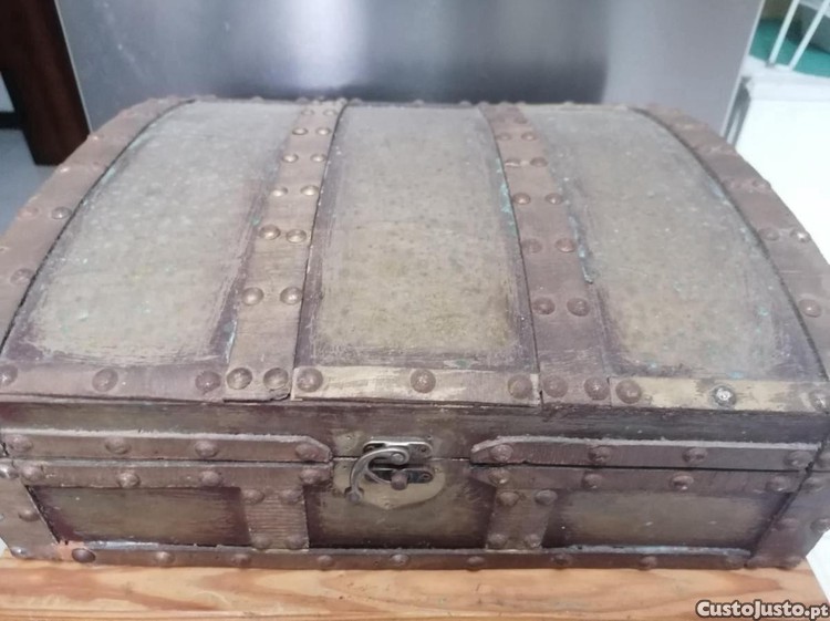 Pequeno baú rústico medindo 40X30X10 de madeira e metal. Inclui o que está lá dentro que se vê nas fotos.