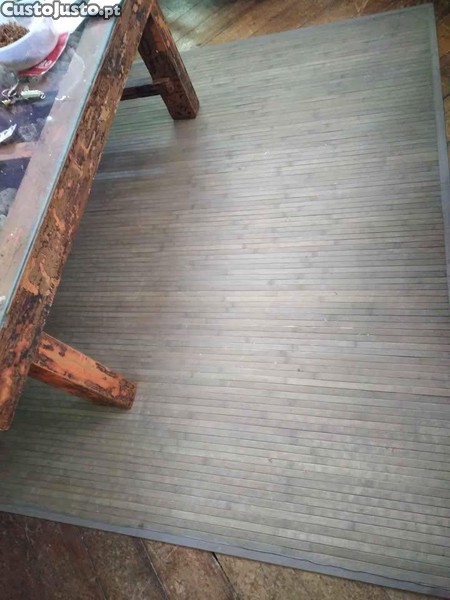 Tapete rústico de ripas de madeira. Mede 170X120. Arrematado com tecido, incluindo a parte inferior. Para interior e exterior. Pode apanhar um pouco de chuva, mas não é anfibio.