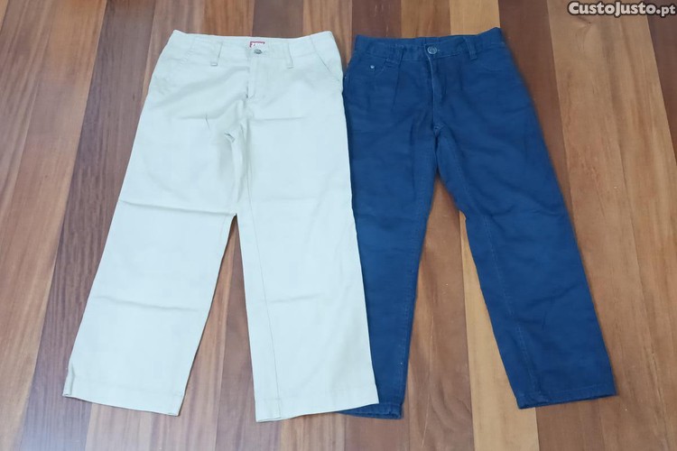 2 Calças de sarja macia de algodão. Corte regular com elástico ajustável na cintura e braguilha com fecho éclair e botão. Umas de cor beje e outras azuis.