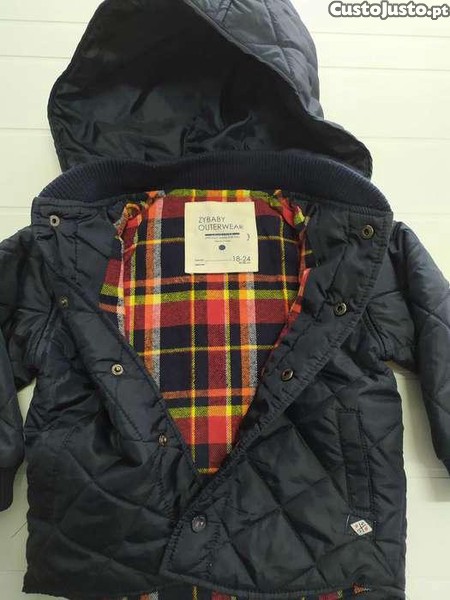 Casaco acolchoado e muito quentinho como novo. De cor azul escuro, marca Zippy, tamanho 18-24 meses, com capuz amovível.