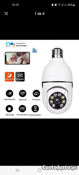 Camara nova, rotativa a 360graus, facil instalacao da aplicacao no telemovel, deteta ao movimento e manda notificacao para telemovel, qualidade de imagem muito boa tanto de dia como de noite, com microfone, trabalha com wifi.