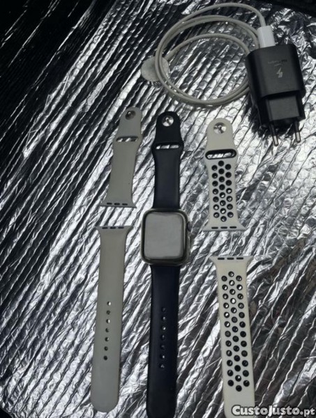 Apple Watch Series 6 de 44mm, com 2 braceletes, proteção de ecrã e carregador.