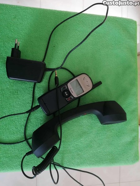 Telemovel com acessório (que funciona como auscultador em todas as marcas). Ideal para ter um segundo numero em casa como alternativa. O telemovel só funciona ligado ao carregador, pois a bateria está viciada.