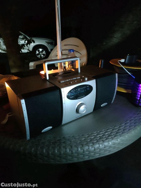 Rádio portátil a pilhas e eletricidade, com gravador leitor de cassetes.