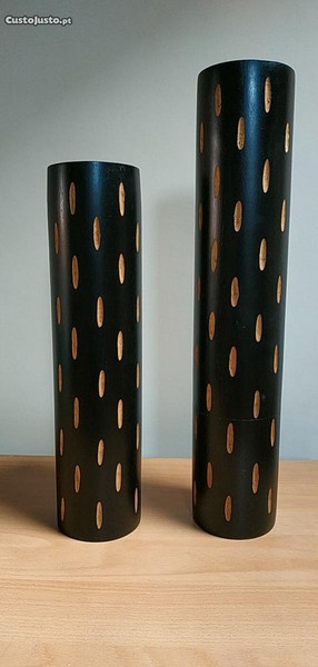 Duas jarras em madeira uma com 50cm de altura e 10cm de base e outra com 40cm de altura e 10cm de base. Entrego em mão em Aveiro por correio acresce o valor dos portes.