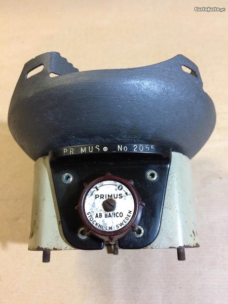 Fogareiro Primus N 2055, antigo e com marcas de oxidação, mas a funcionar perfeitamente, com regulação da intensidade da chama na torneira (sem garrafa).