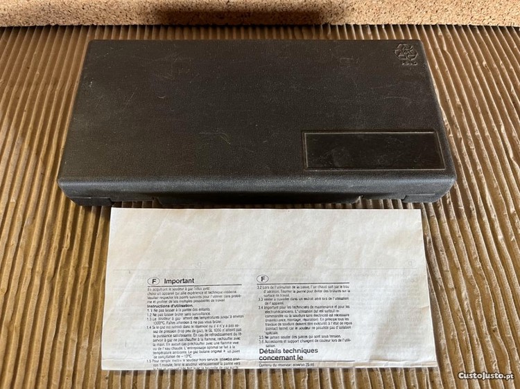 Em falta o maçarico sobrando os vários acessórios ponteiras de vários formatos e dimensões, espalhador, suporte de maçarico, etc. acondicionados no estojo original, acompanhados de folheto com instruções em francês e alemão.