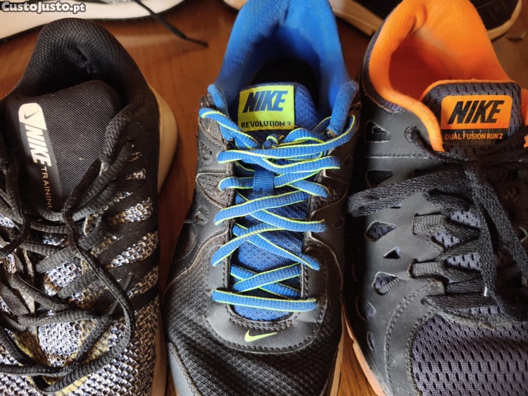 3 pares de sapatilhas NIKE, usadas , mas em bom estado. Nº 41. Cor: um par azul e preto (revolution); um par laranja e preto (Dual fusion run 2); outro par cinza e preto (Trainning). São perfeitas para um visual desportivo e confortável.