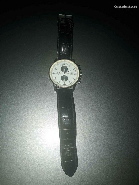 Em aço com pulseira em couro preta. Water resistant 5ATM