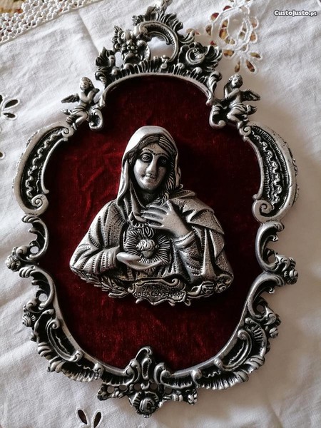 Quadro de Sagrado coração de Maria em estanho e veludo de 1973. Altura de 35 cm. Entrego em mão num raio de 10 km. Envio acresce o valor de portes