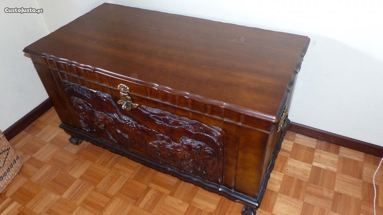 Baú em mogno africano, com imagem frontal em relevo feito à mão e "pés de leão". Em excelente estado.