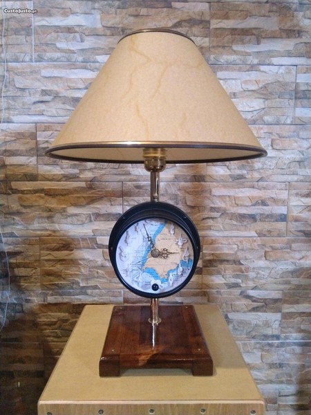 Candeeiro com um relógio feito com a caixa de um antigo voltímetro restaurada, fixa em tubo latão e base madeira com 16,5x18,5cm e 35cm altura. Abajur não incluído.