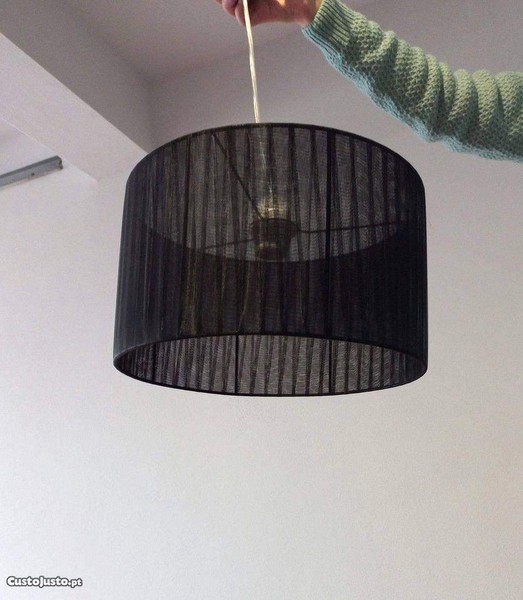 Vendo dois candeeiros de tecto, em tecido preto semitransparente, ambos em bom estado. Diâmetro/altura: o maior tem 45cm/20cm e o mais pequeno tem 35cm/20cm.