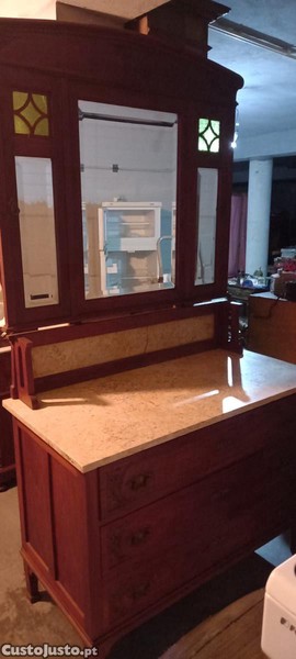 Cómoda antiga de madeira nobre com pedra mármore e espelhos