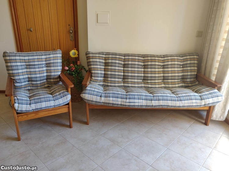 Preço: 175 €Conjunto sofás em madeira (3 lugares + 1 lugar) com almofadões acolchoados