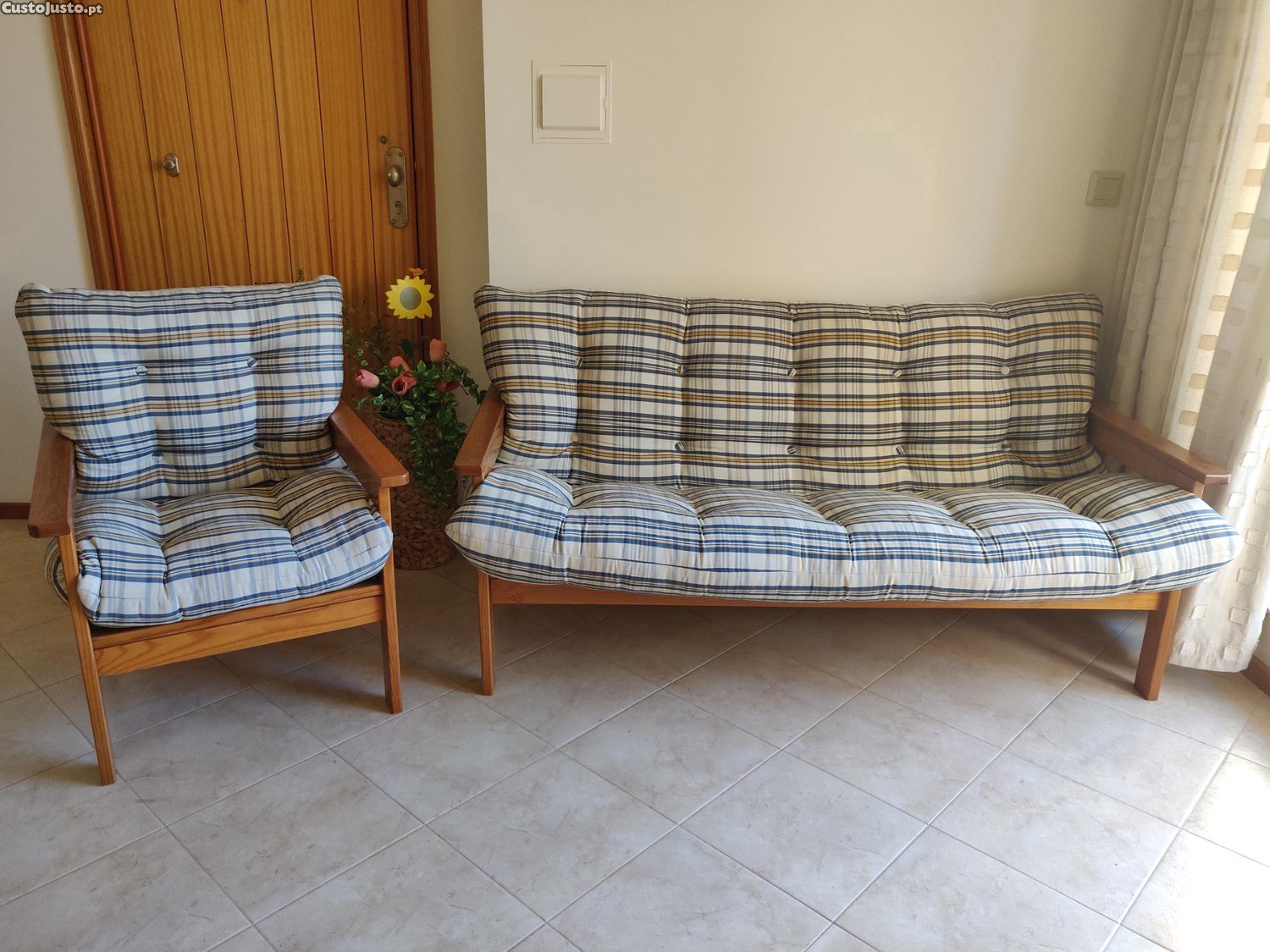 Conjunto sofás em madeira (3 lugares + 1 lugar) com almofadões acolchoados