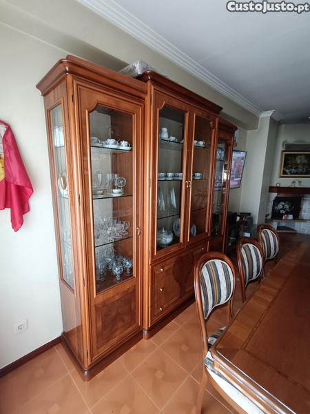 Vendo este móvel de sala em madeira pelo motivo de ter de mudar. Tem 2 portas laterais em vidro, e 2 portas frontais em vidro com várias prateleiras para colocar as peças mais que lhes convém, e 3 gavetas
