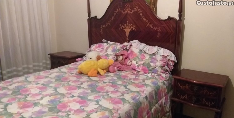 Conjunto de móveis para quarto, com um design clássico e elegante. O conjunto é composto por cama, duas mesas de cabeceira, guarda-fatos, cómoda, toucador com banco e cadeira.