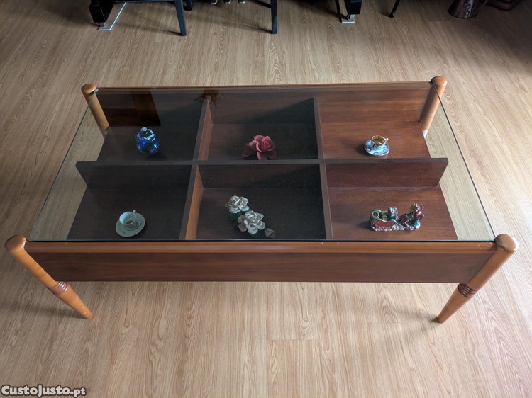 Pretendo vender um móvel de sala de madeira maciça com tampo em vidro, com vários compartimentos de arrumação. Em bom estado!