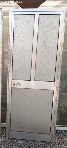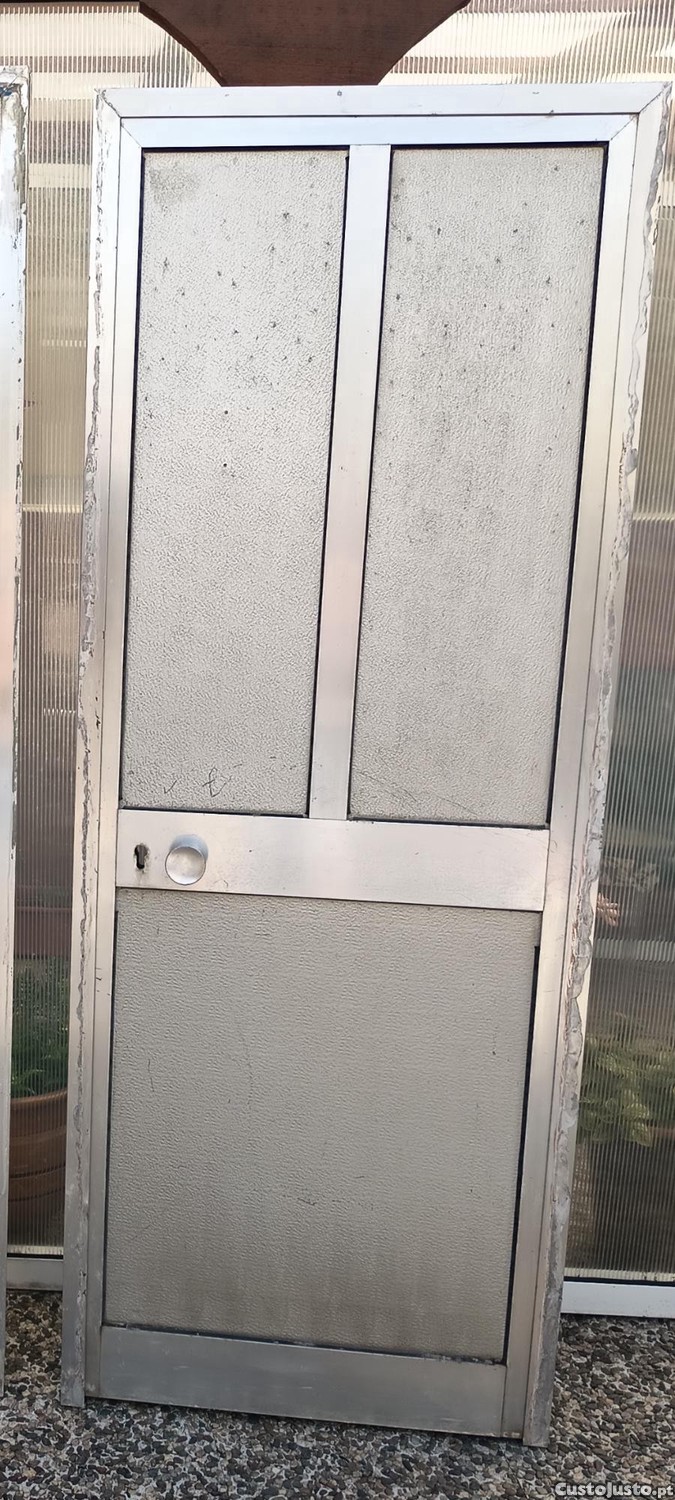 Vendo uma porta alumínio pequena em altura com aros em estado razoável.Marcas de silicone nos aros e salpicos de cimento Ideal para anexo ou arrecadação.