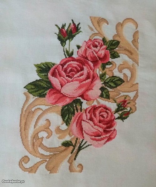 Quadro "Rosas com arabesco dourado", em ponto cruz. O seu valor é de 70EUR + portes de envio