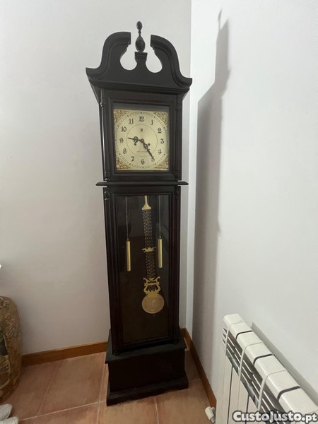 ndo relógio de pêndulo grande da marca JIA FU, com design clássico e numeração vintage. Ideal para quem aprecia decoração tradicional ou procura um toque elegante para salas, halls ou escritórios.