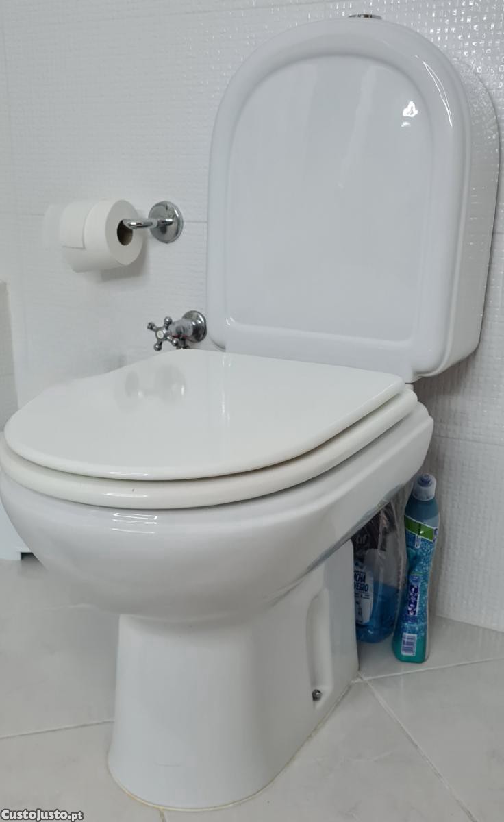 Marca Indusa (atual Sanindusa) Usados, em pleno funcionamento, sem estaladelas nem defeitos, sem fugas de água. Com mangas de ligação à água. Sanita: autoclismo de 2019, marca Oli, a funcionar a 100%; descarga ao chão; foto com ficha técnica do modelo atual, equivalente a este; tampo de madeira lacada de 2019. Torneira com marcas de uso incluída no bidé.