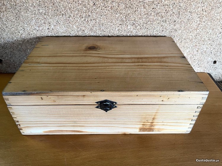 Caixa de madeira de pinho, com nove divisões (que se podem retirar ficando ampla), construída com malhetes, o que lhe confere especial segurança e robustez.