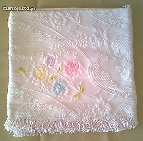 Colcha, em poliéster, toque acetinado, com motivos pintados, antiga, nunca usada, nova no saco de compra original, tamanho ca. 2,0m x 2,4m. Disponíveis duas diferentes, verde água ou rosa.