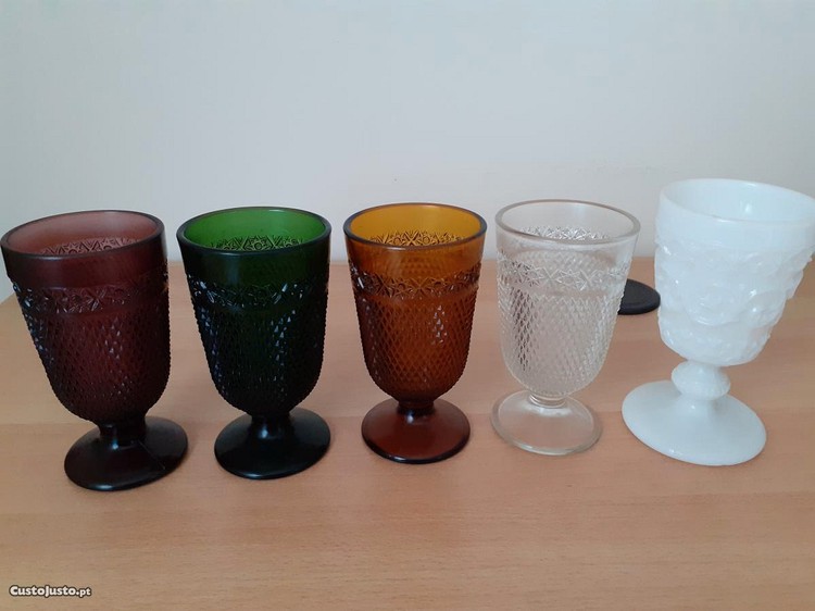 Lote de 6 copos com piquinhos, 15 EUR : 2 bordeaux, 2 verdes, 2 âmbar.
