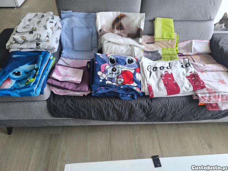 lençols para cama de 190cm por 90cm mais capa de edredao para edredao com dimensao maxima de 140cm por 200cm ... para escolher entre os das fotos com1 lençol mais 1 capa de edredao por 5 euros cada lote ... tudo em perfeito estado sem buracos ou manchas . So me restam as capas tiradas nas fotos individualmente