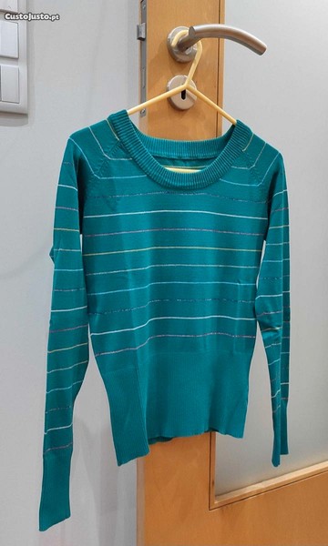Camisola verde com riscas multicolores, sem etiqueta, com medidas nas fotos.