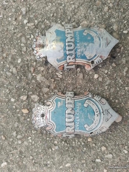 Chapinhas de testa TRIUMPH made in ingland para bicicletas da marca ou para colecionadores para o seu restauro como mostra as fotos tenho mais bicicletas e peças ver os meus outros anúncios para contactar ou tirar alguma duvida através do anuncio enviar mensagem ao anunciante ou através do contacto que está no anuncio muito obrigado.nota o preço mencionado é das duas..