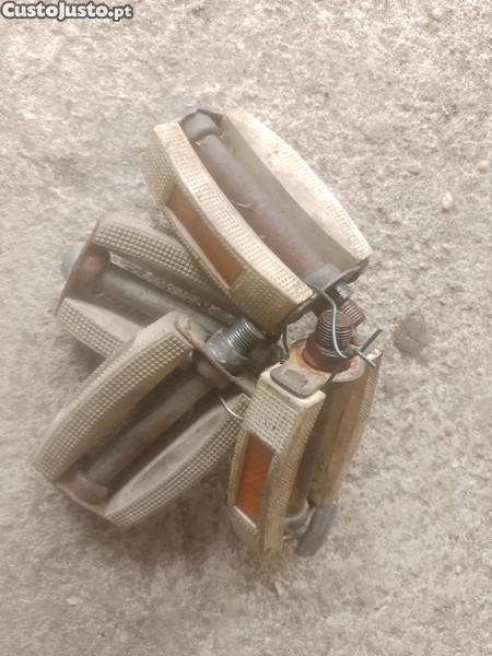 Dois pares de pedais antigos nacionais para bicicletas dobráveis e outras estão bons não estão partidos ou danificados completamente funcionais se for para restauro é limpar as borrachas e desmontar e zincar estão como mostra as fotos tenho mais bicicletas e peças ver os meus outros anúncios para contactar ou tirar alguma duvida através do anuncio enviar mensagem ao anunciante muito obrigado nota: o preço mencionado é dos dois pares(10 por par)