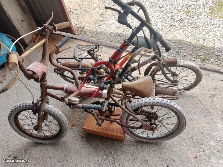 Lote de 4 bicicletas de criança para restauro antigas uma BMX roda 16 e duas dobraveis uma M12 (roda12) e outra roda 14 M14 e ainda uma quadro também roda 12 mas mais recente estão como mostra as fotos para restauro ou peças tenho mais bicicletas e peças ver os meus outros anúncios para contactar ou tirar alguma duvida através do anuncio enviar mensagem ao anunciante ou através do contacto que está no anuncio muito obrigado.. nota: o preço mencionado é das quatro e não é negociável.