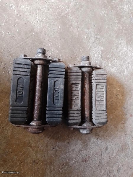 Par de pedais antigos 1- IVOL(esquerdo) 1 -FERMEN(direito) Atenção consoante descrição anterior e titulo estes pedais embora seja direto e esquerdo são diferentes como se vê nas fotos um IVOL e outro FERMEN são adequados para casar com outros da marca ou tirar as borrachas que estao novas ou peças em geral vendo separado estão como mostra as fotos e em perfeito estado de funcionamento tenho mais bicicletas e peças ver os meus outros anúncios para contactar ou tirar alguma duvida através do anuncio enviar mensagem ao anunciante ou através do contacto que está no anuncio muito obrigado.O preço mencionado é do par dois.