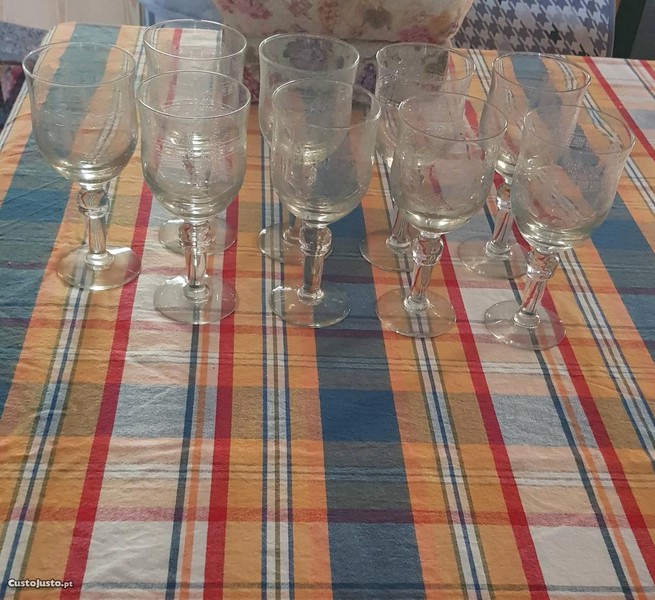 9 copos de água em cristal, com desenhos em relevo, dos anos 70. Mede 7,3cm de diâmetro e 16,6cm de altura.