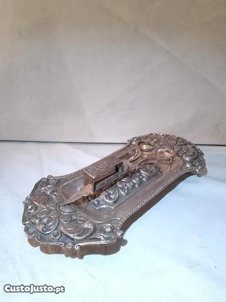 Bandeja e Tesoura de Morrões em prata com motivos florais relevados e assente sobre quatro pés. Marcação Porto Corôa. Dimensões: 25x 11,5cm Peso 268gr Tenho outros peças disponíveis, ver nos outros negócios.
