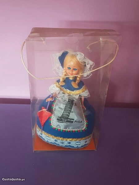 Boneca tipica de Pisa - Itália, com roupa em tons de azul e branco, com sombrinha vermelha, dos anos 60/70. 22cm de altura.