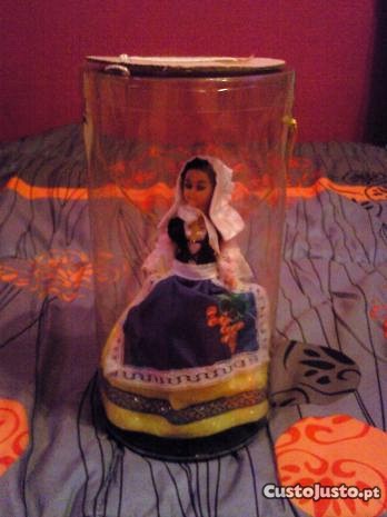 Boneca antiga de Vigneronne - França, com saia amarela em seda bom barra azul e dourada, avental azul com rendas brancas e cacho de uvas, blusa branca com rendas, corpete preto, chapéu em seda branco que aperta com laço, traz cruz dourada ao pescoço. 18,5cm.