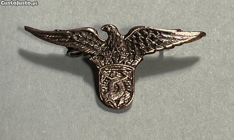 Emblema com águia a encimar brasão com castelos e dois peixes entrelaçados, desconhecendo a sua origem simbólica.