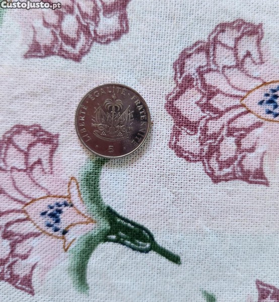 Moeda de 5 Cêntimos, da República do Haiti. Na parte de trás inscrição: Liberdade, Igualdade, Fraternidade. Do ano de 1997.