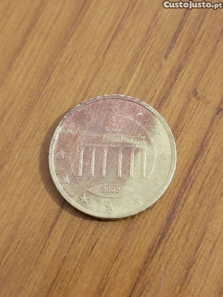 Moeda de 50 cêntimos da Alemanha 2002 com defeito na composição do metal de que são feitas. Esta em específico tem ausência do alumínio, metal que faz parte na composição das moedas de 10, 20 e 50 cêntimos.