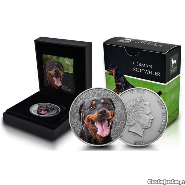 Preço: 110 €Niue 1 $ 2015 Rottweiler 1 onça de prata colorida acabamento antigo